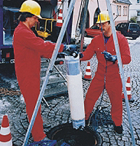 Der präparierte Packer wird nun über Luftschiebestangen in den Kanal eingeführt und an die Schadensstelle positioniert.